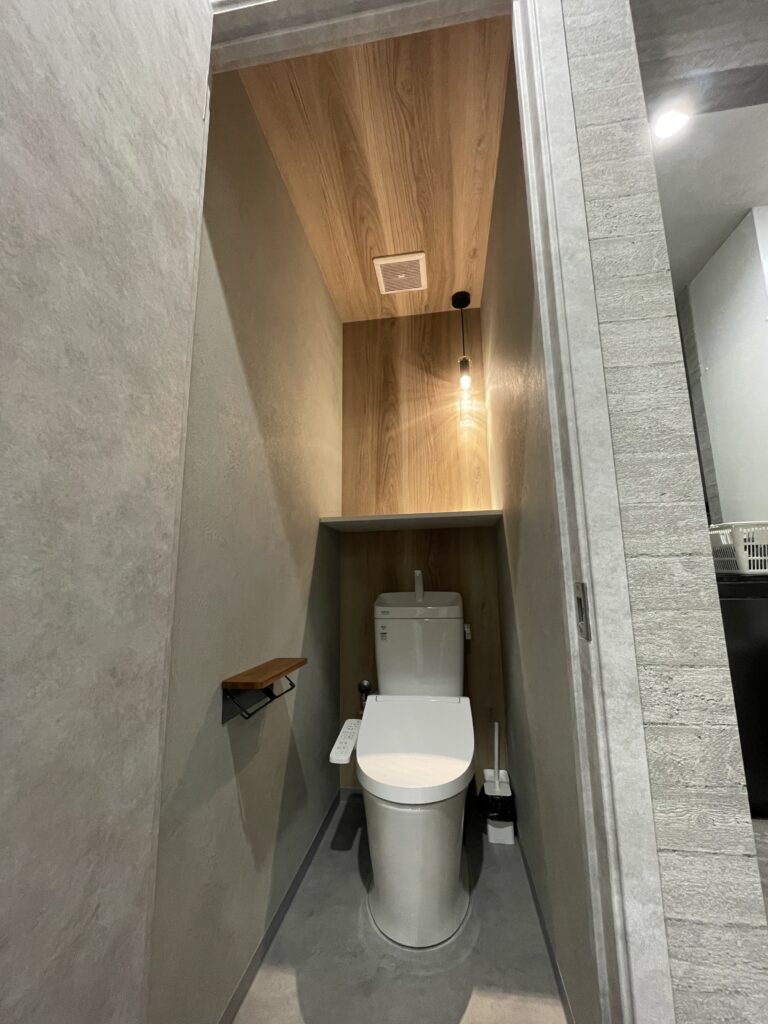 トイレの枠材や扉にもこだわり、ダイノックシートを張っています。